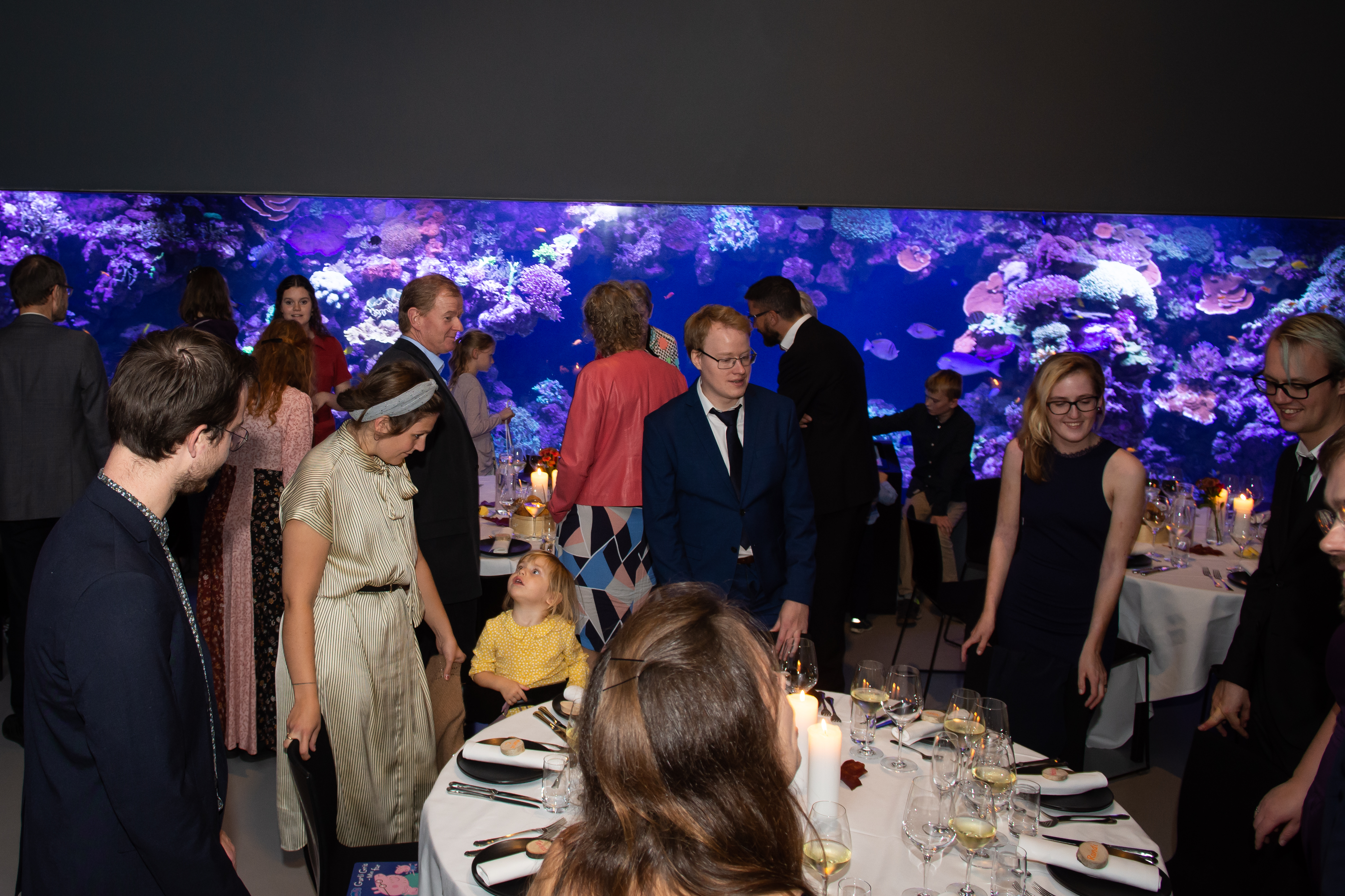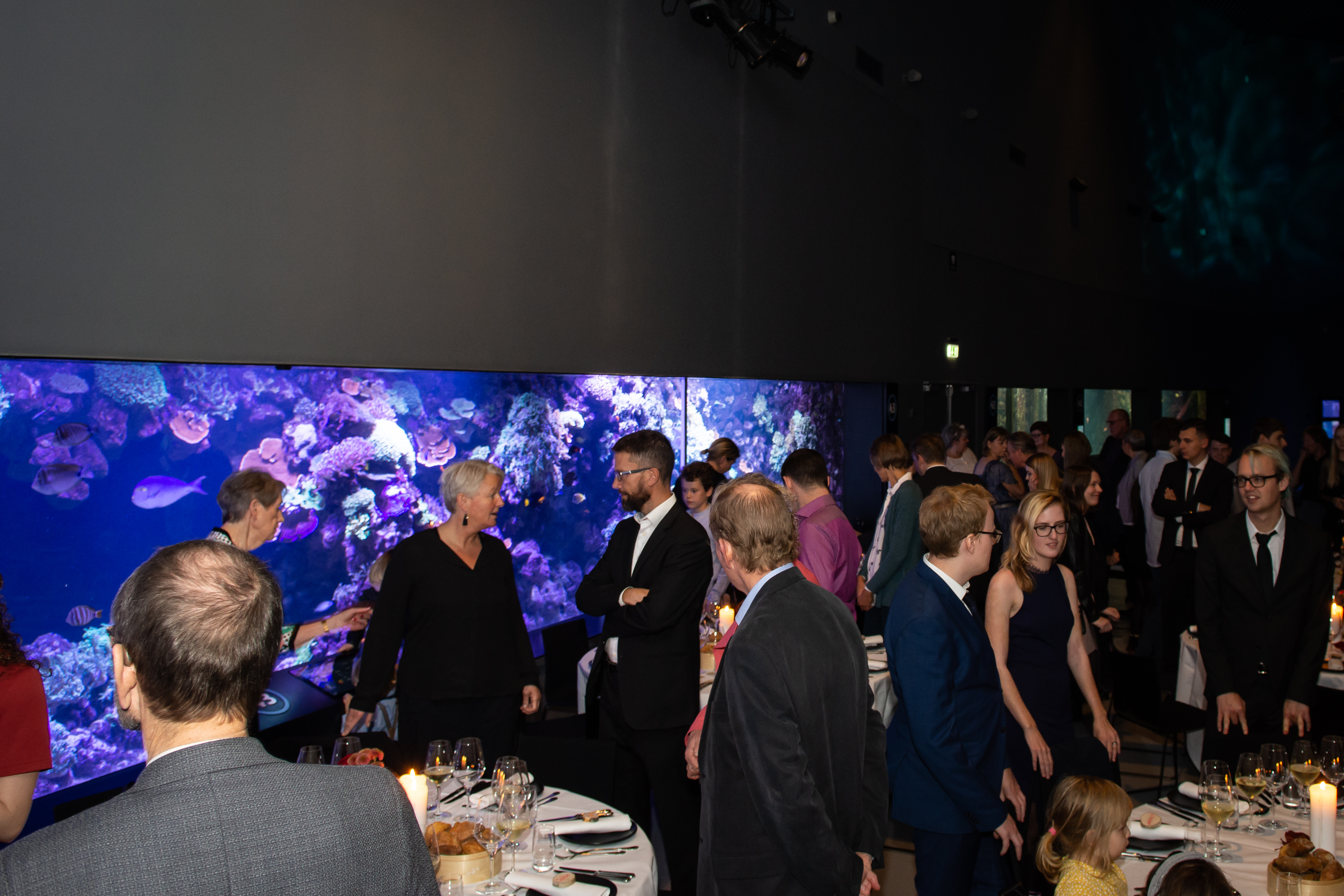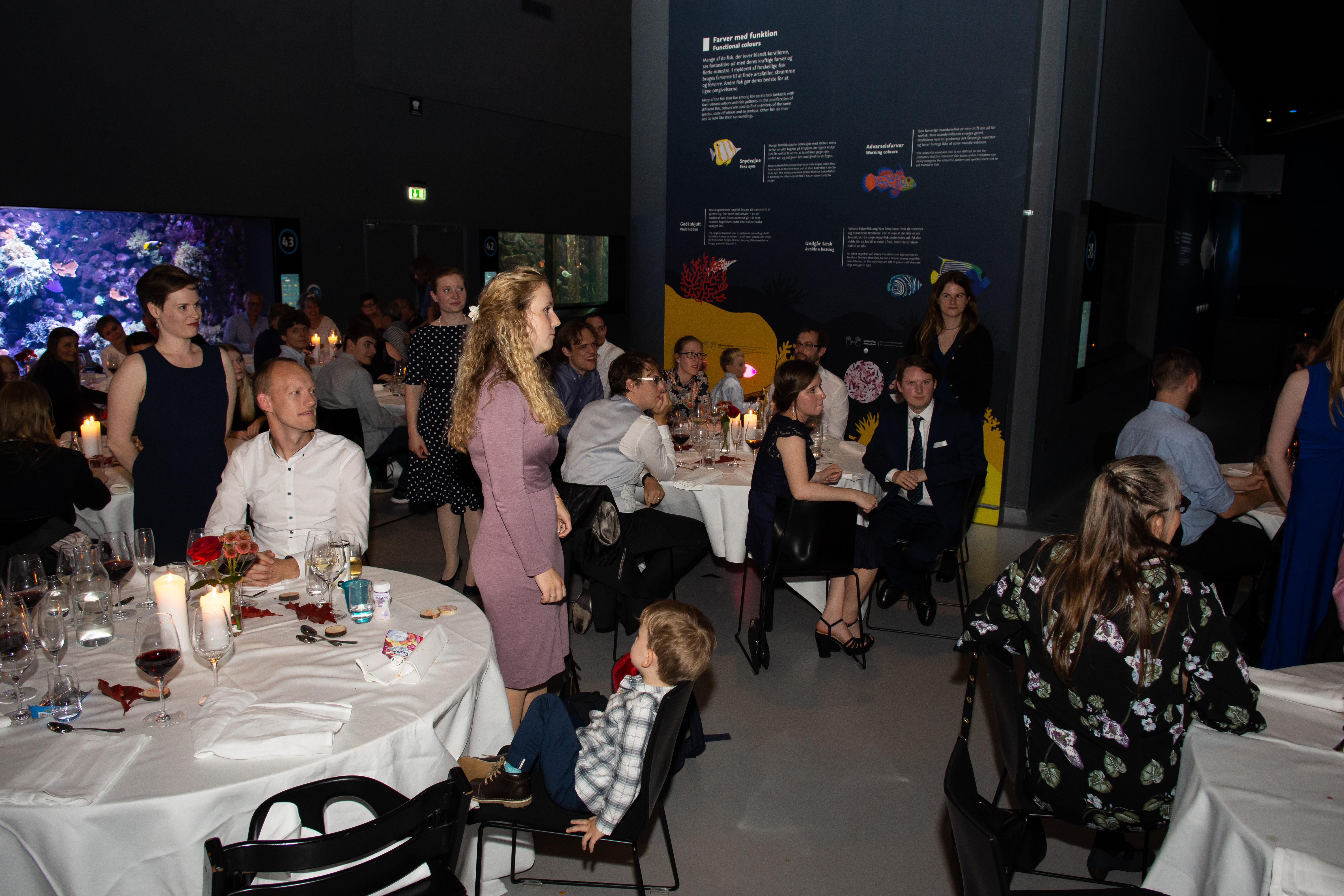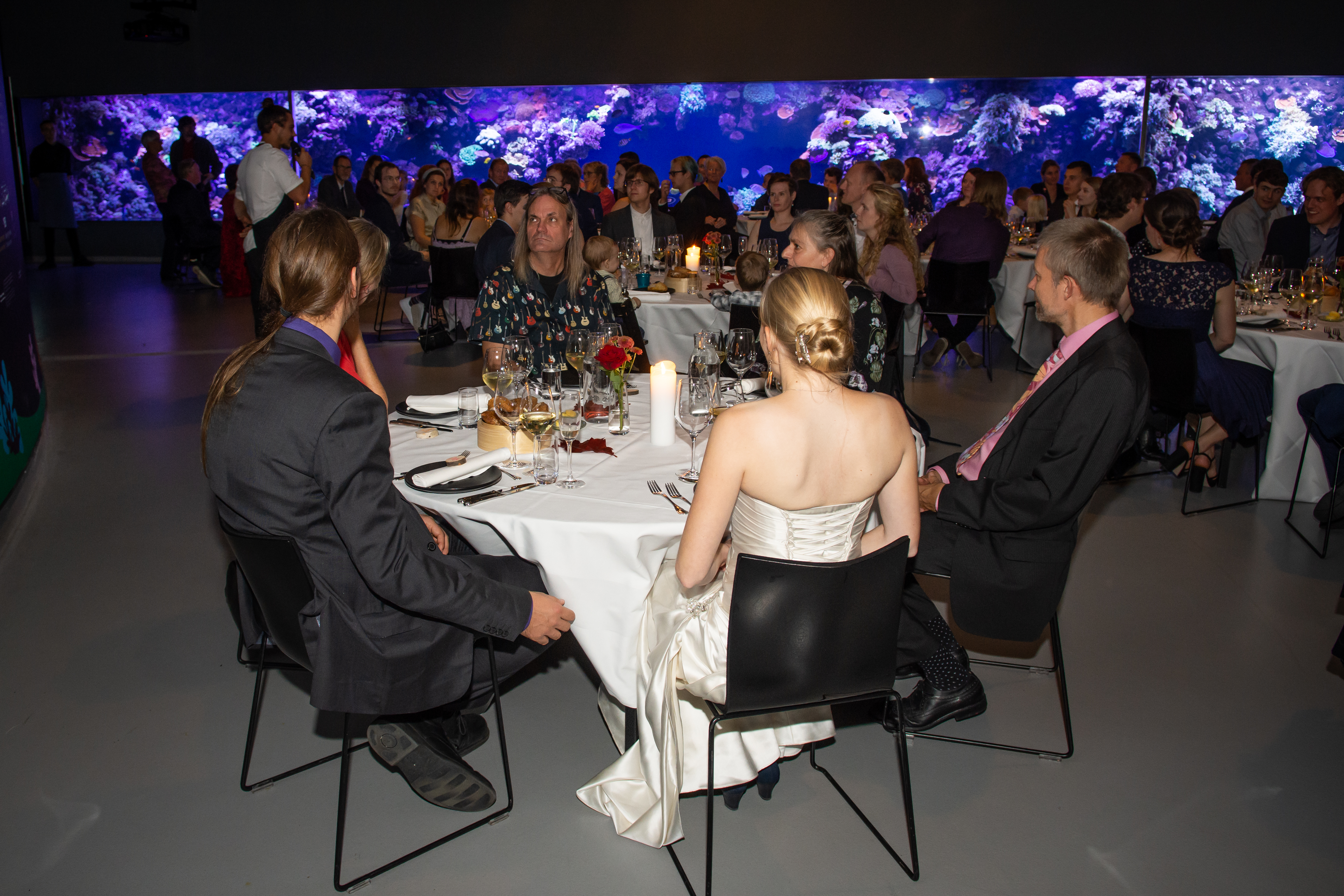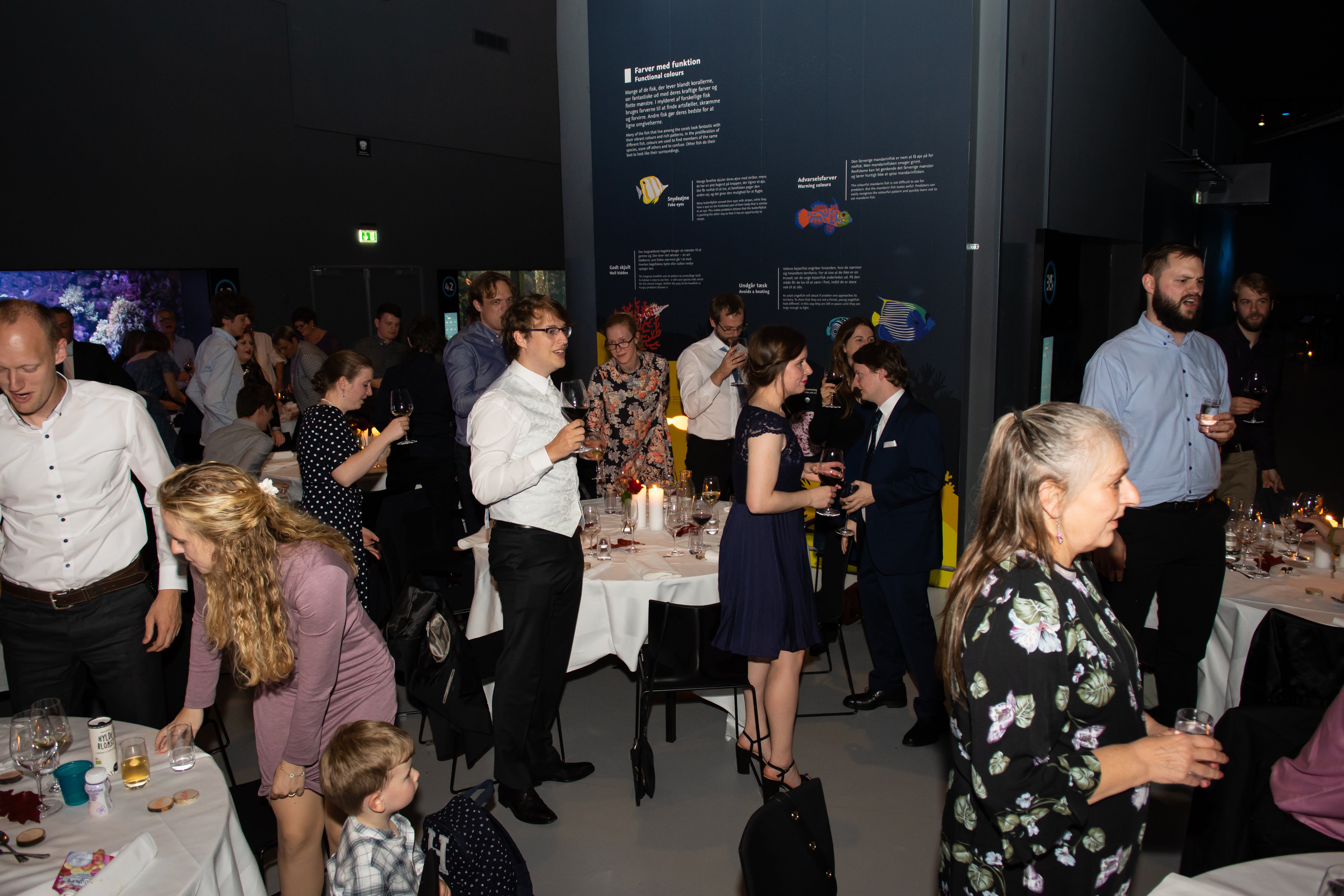 Festen forgår på Den Blå Planet. De holder åbent for deres normale besøgende indtil kl. 17 og derefter skal de nå at gøre klar til festen. Derfor vil det ikke være muligt at komme ind før kl. , hvor vi vil starte ud med velkomstdrinks.