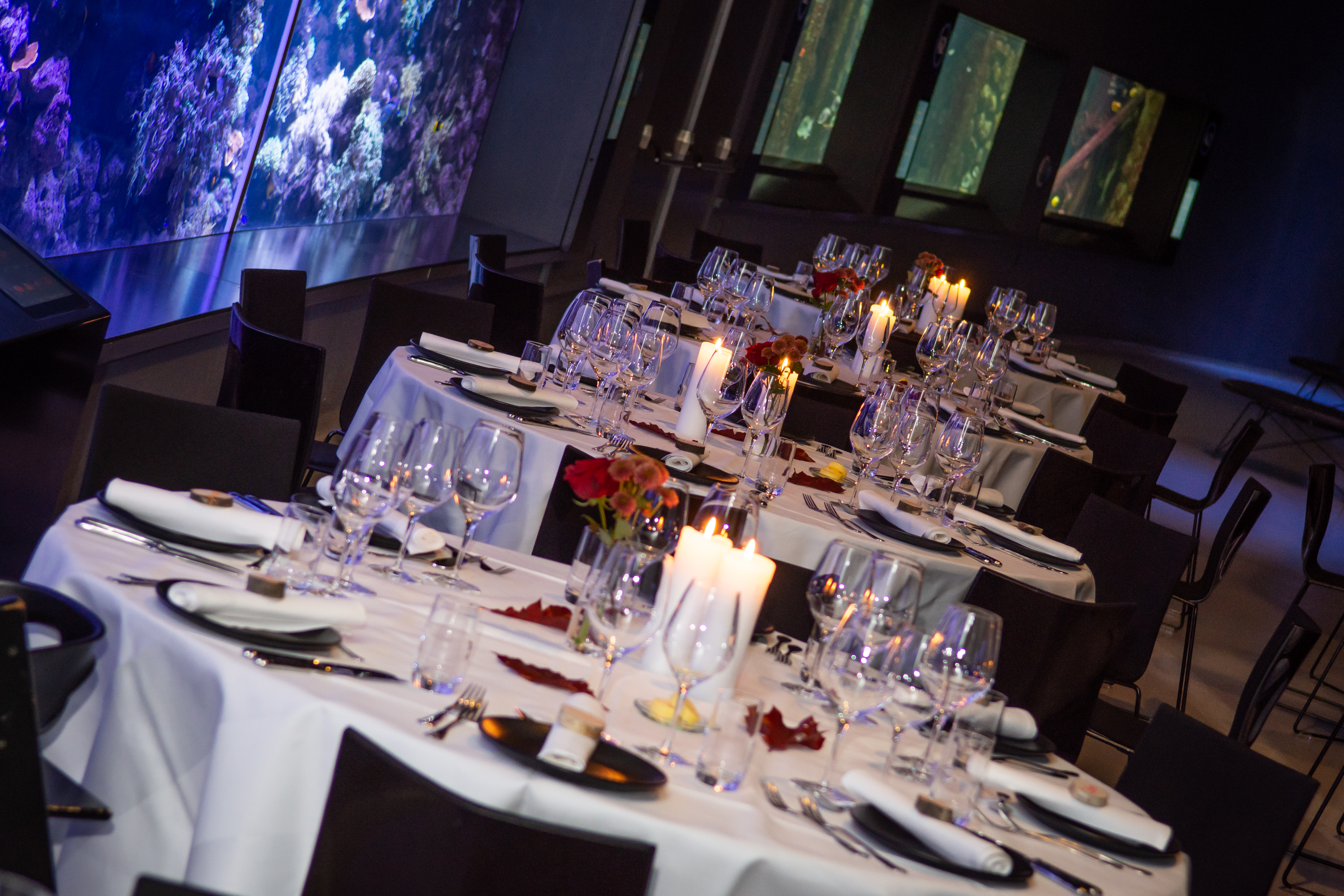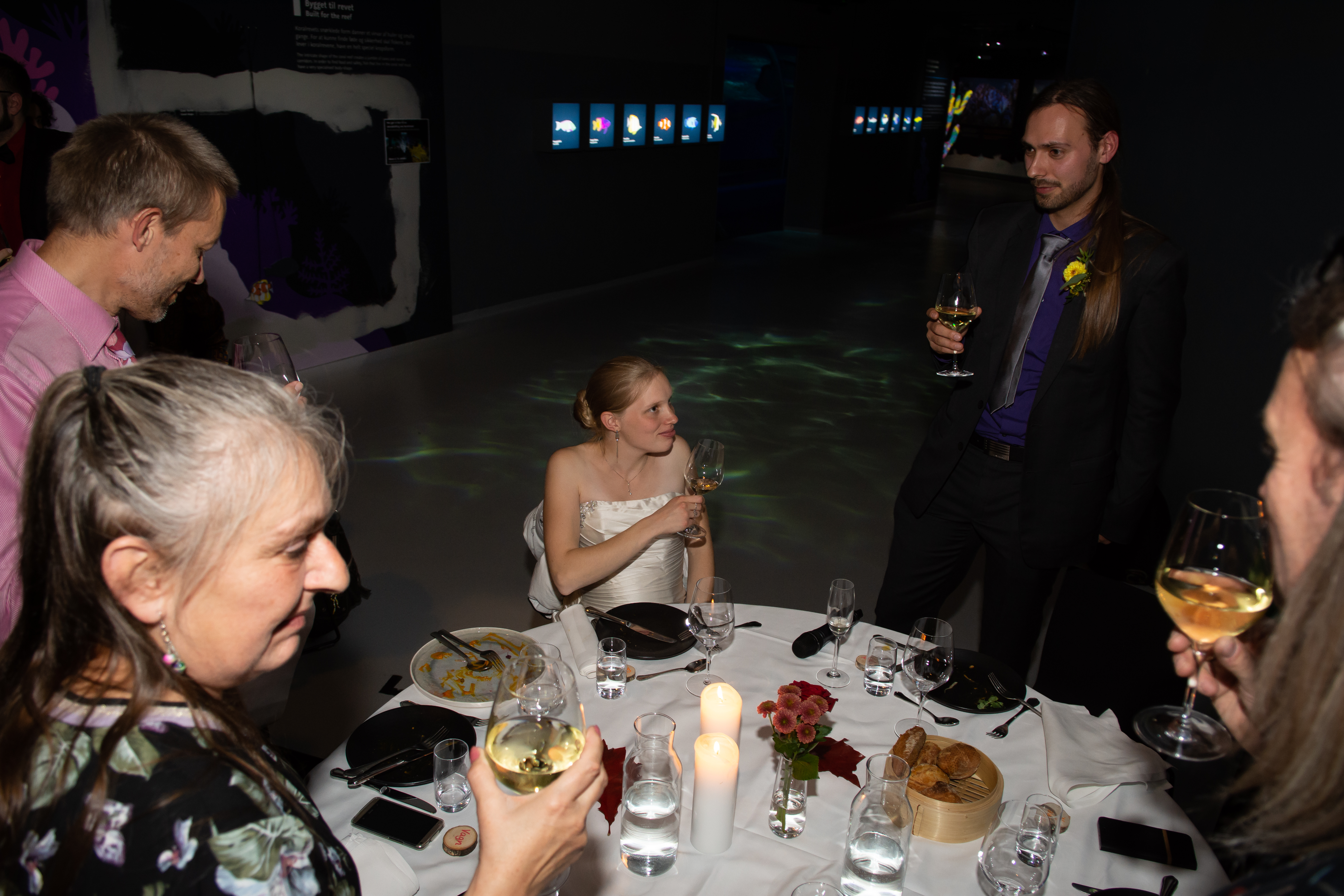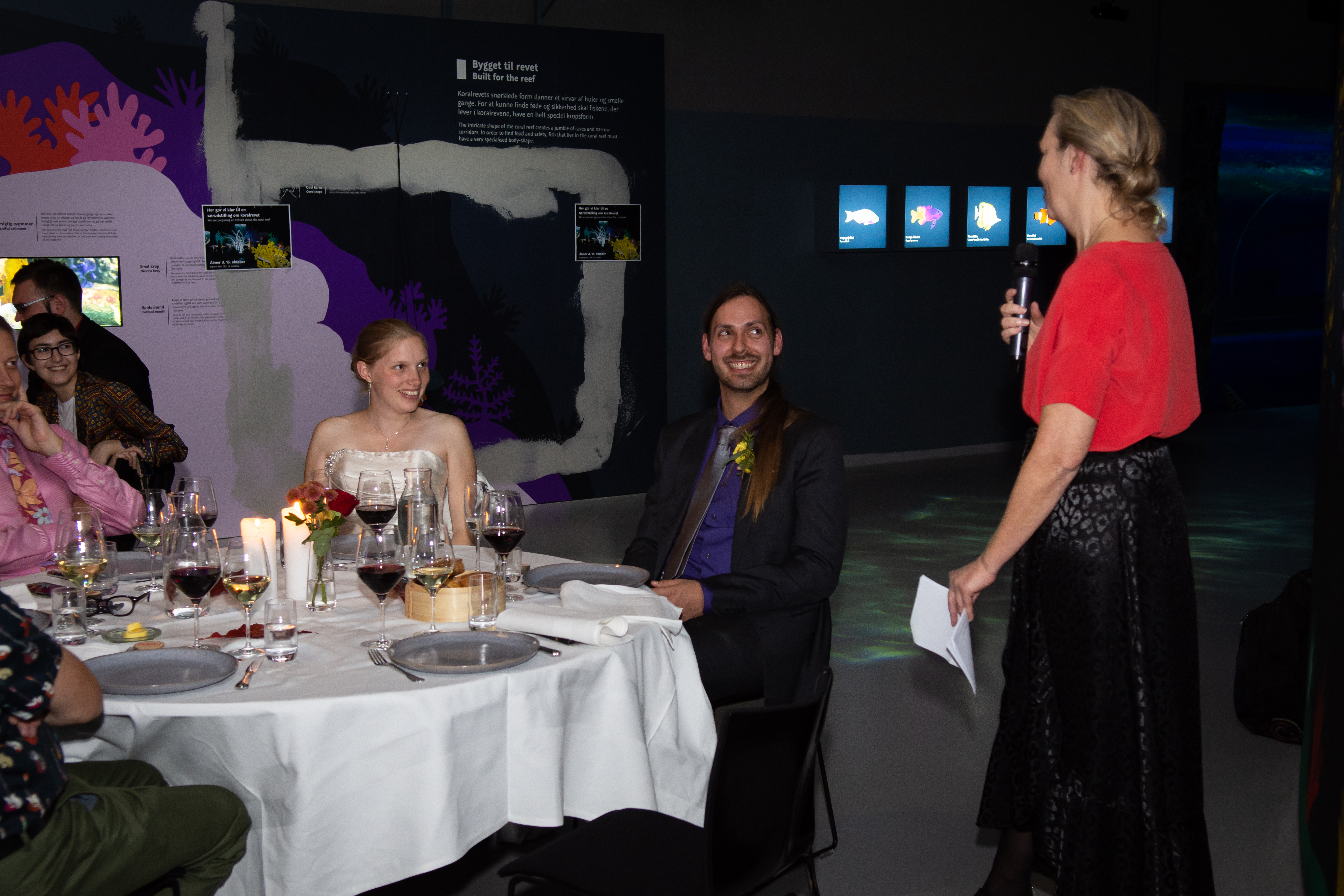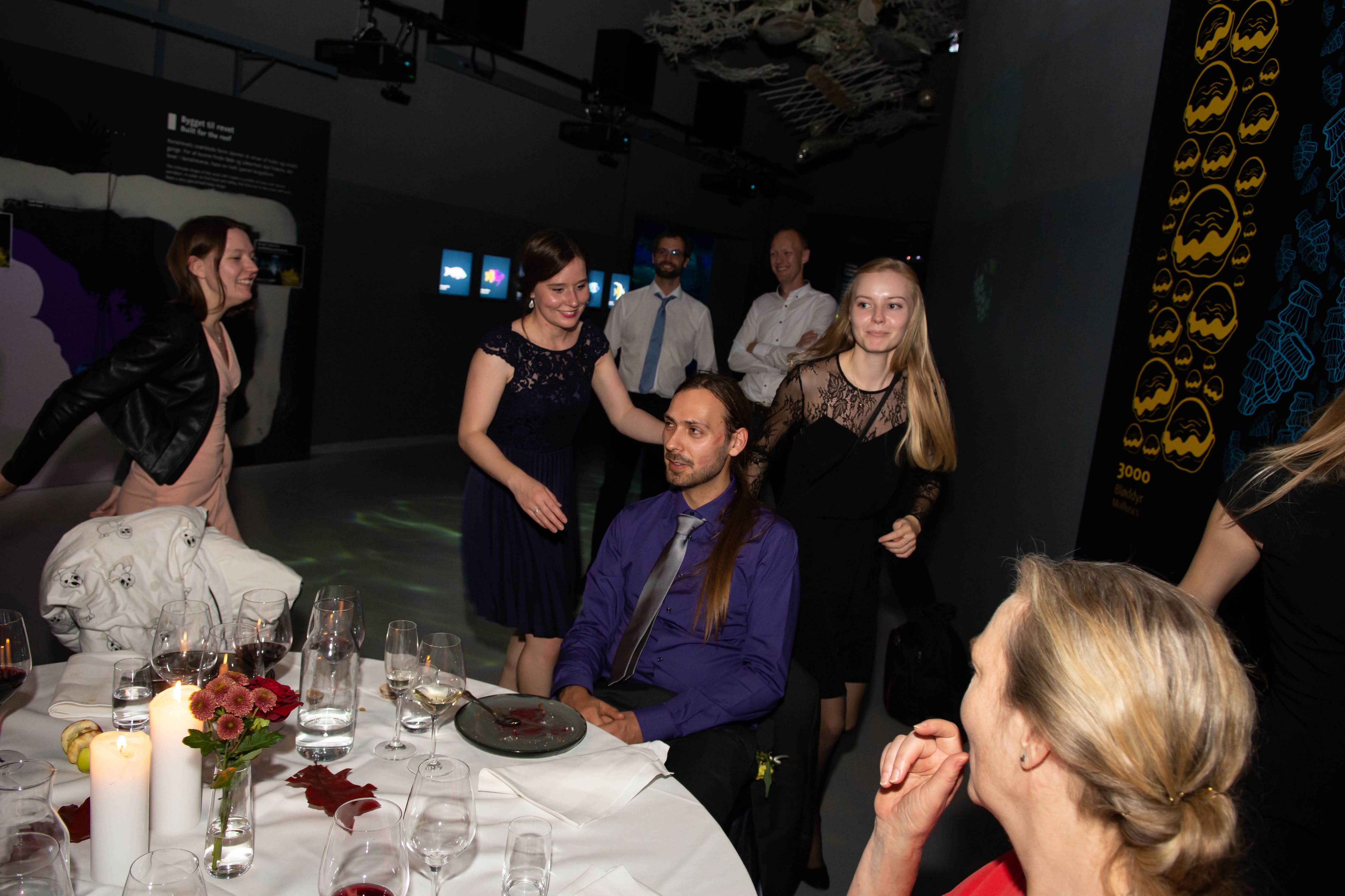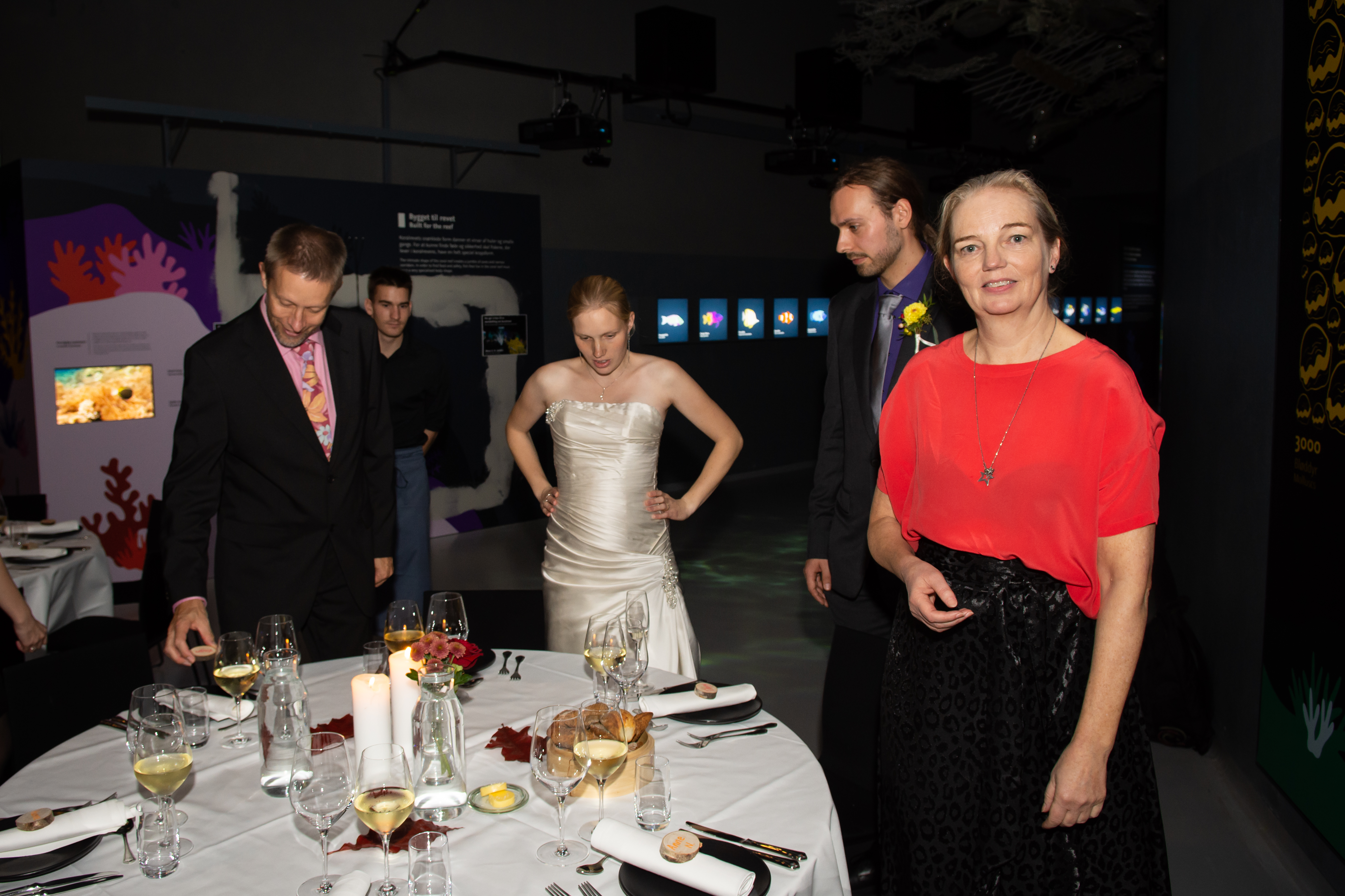 Festen forgår på Den Blå Planet. De holder åbent for deres normale besøgende indtil kl. 17 og derefter skal de nå at gøre klar til festen. Derfor vil det ikke være muligt at komme ind før kl. , hvor vi vil starte ud med velkomstdrinks.