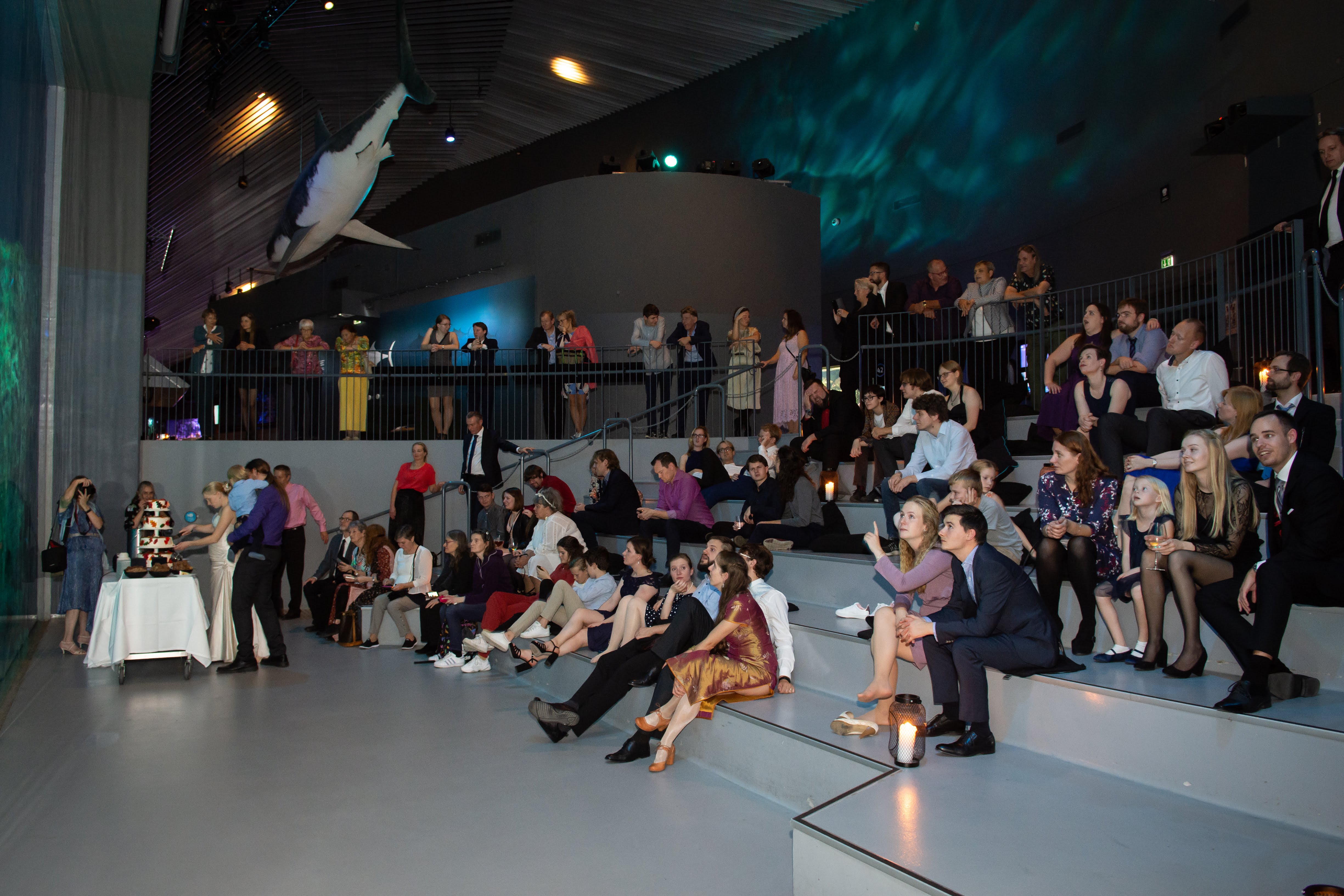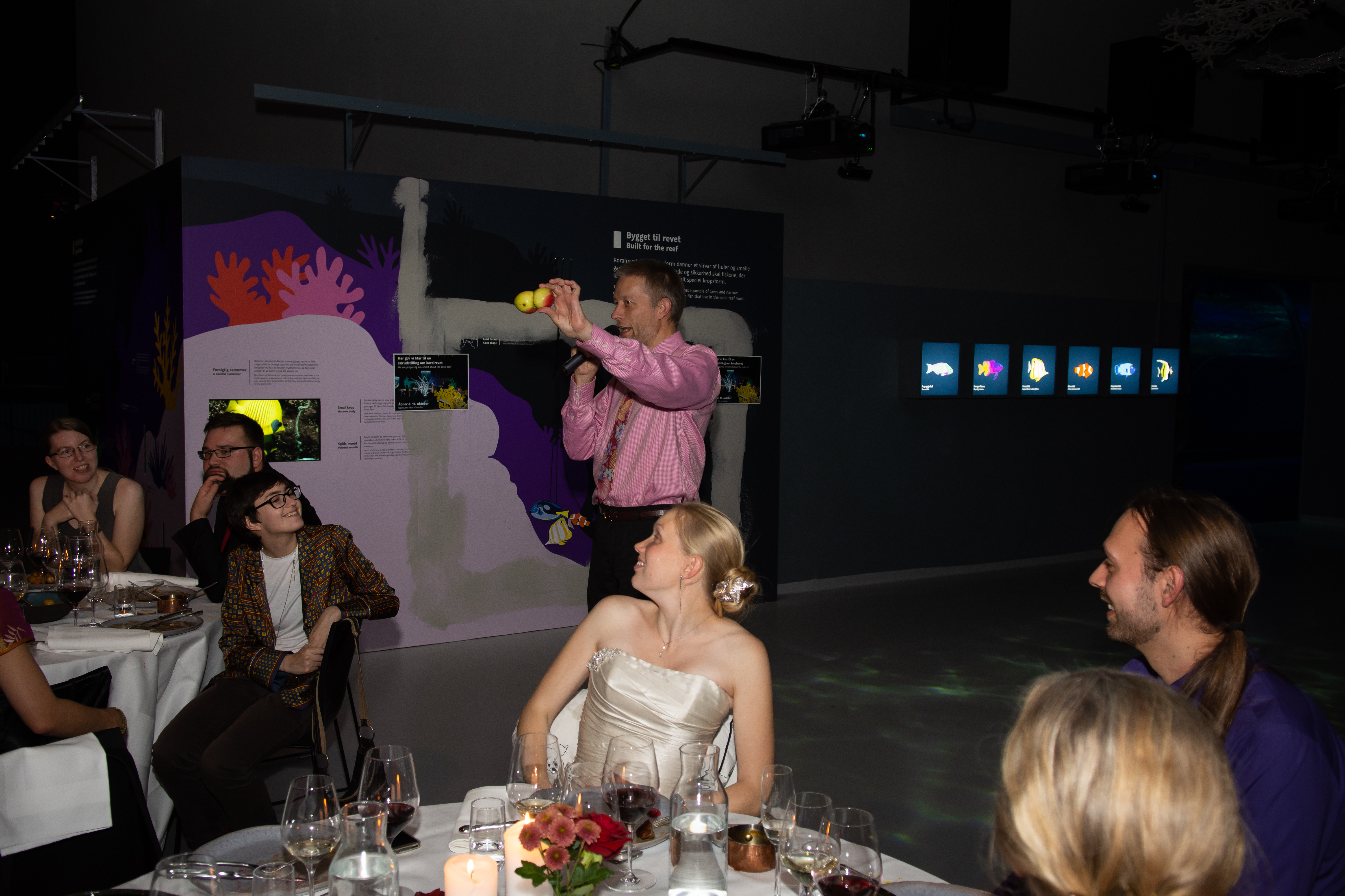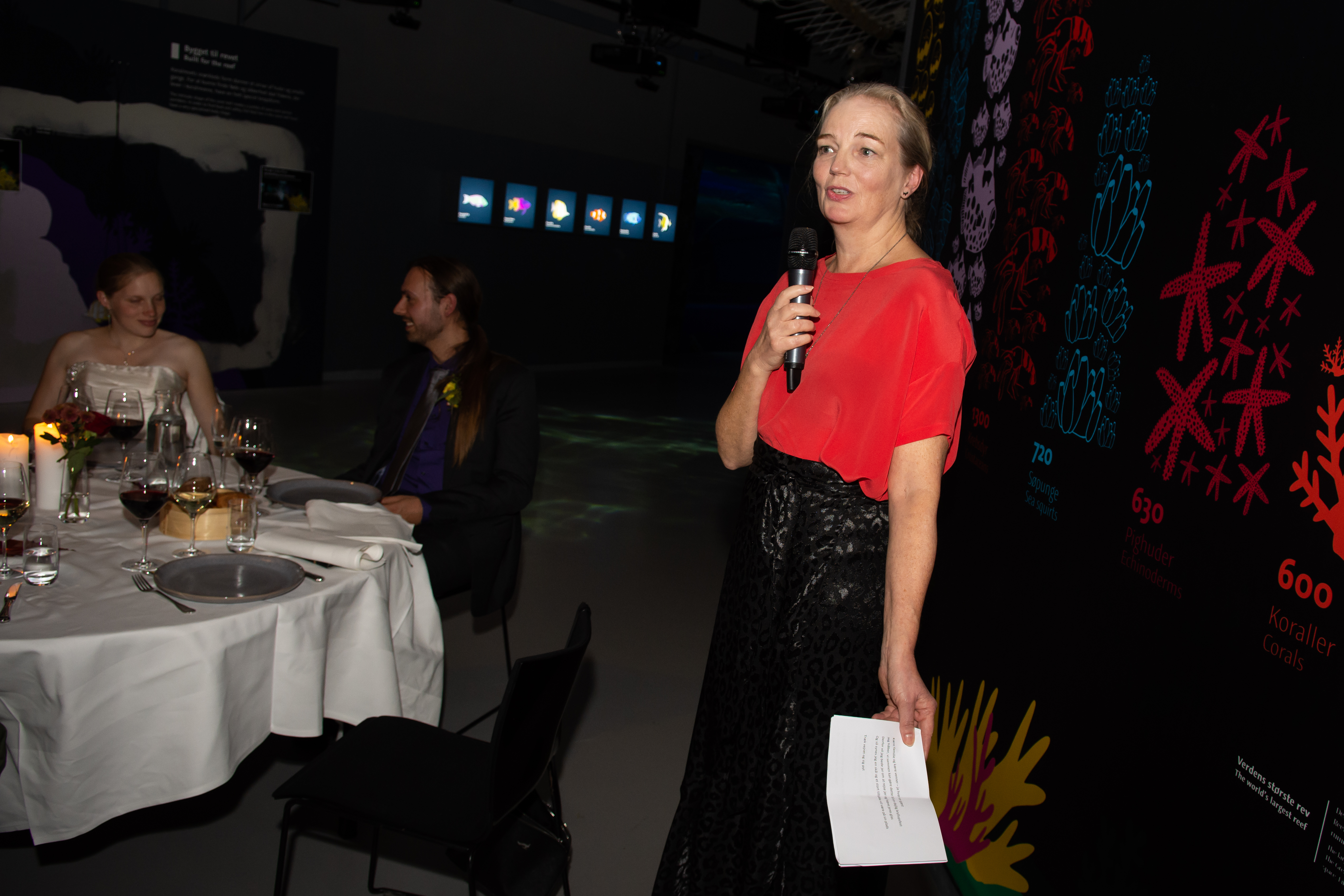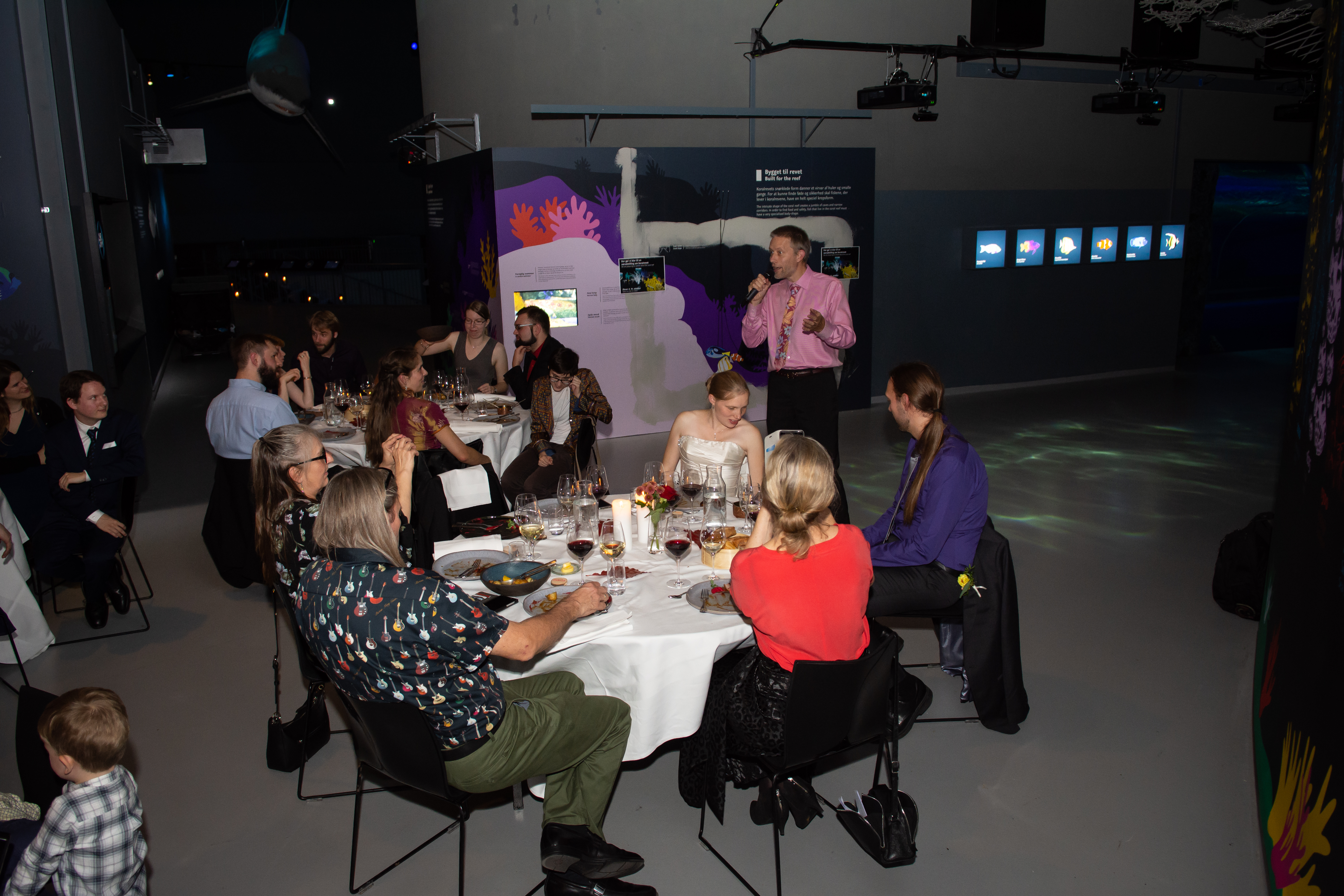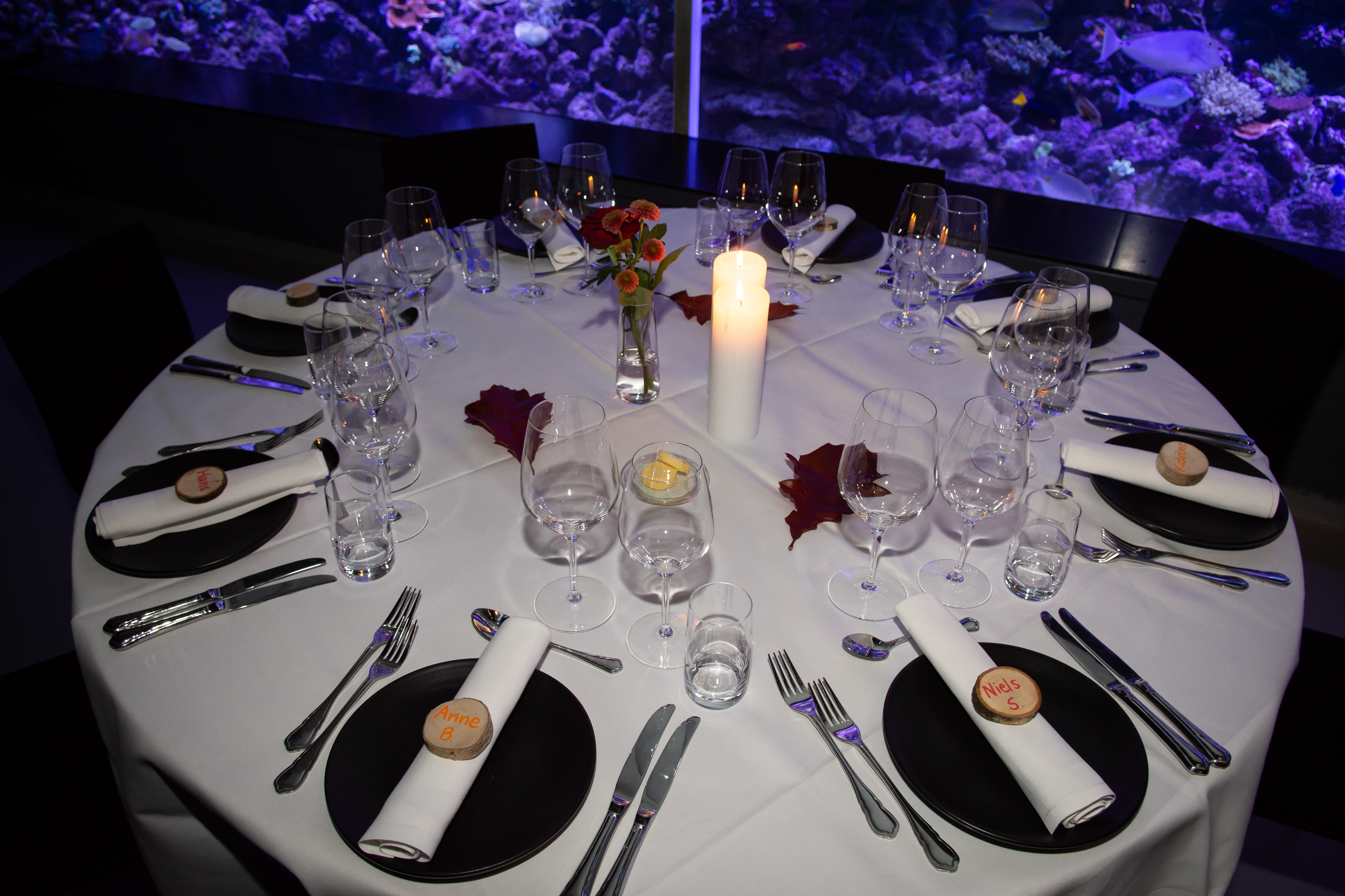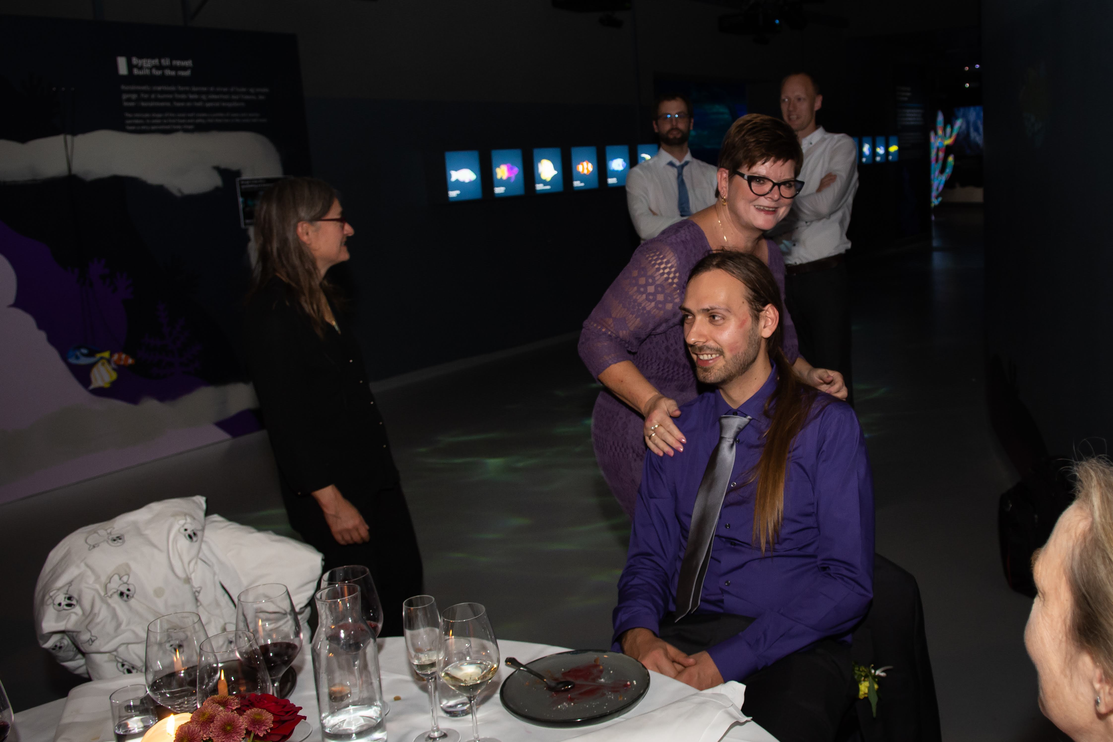 Festen forgår på Den Blå Planet. De holder åbent for deres normale besøgende indtil kl. 17 og derefter skal de nå at gøre klar til festen. Derfor vil det ikke være muligt at komme ind før kl. , hvor vi vil starte ud med velkomstdrinks.