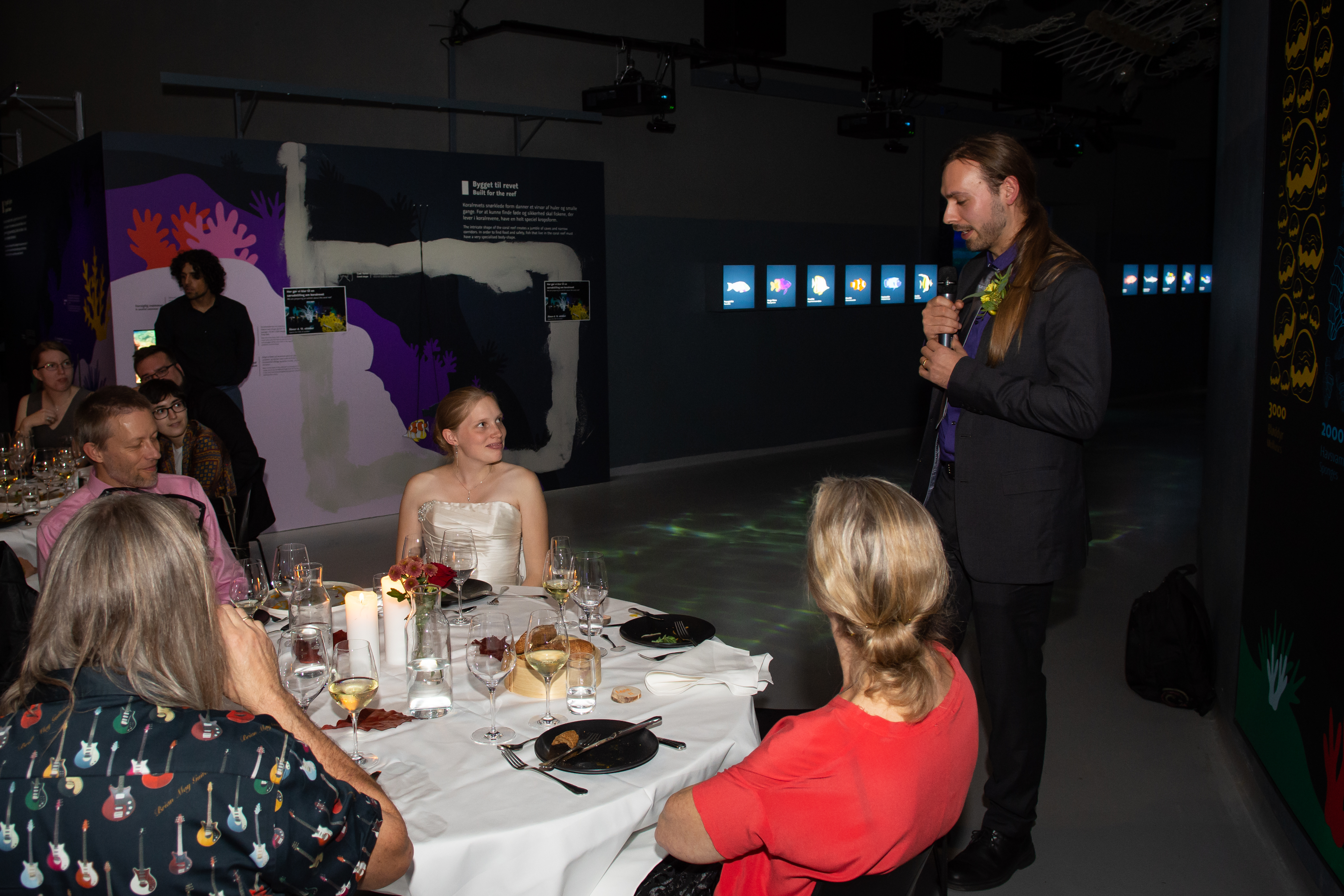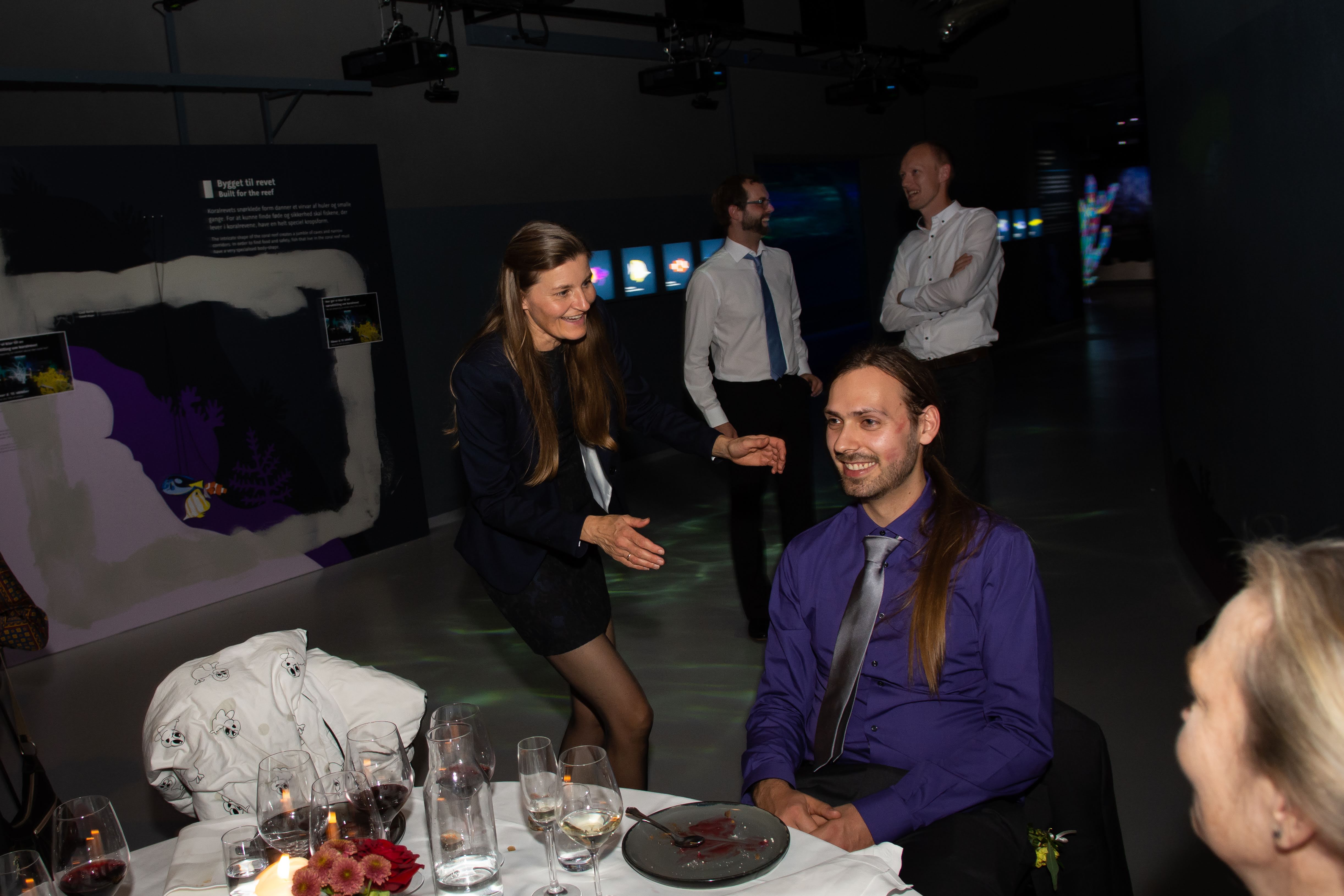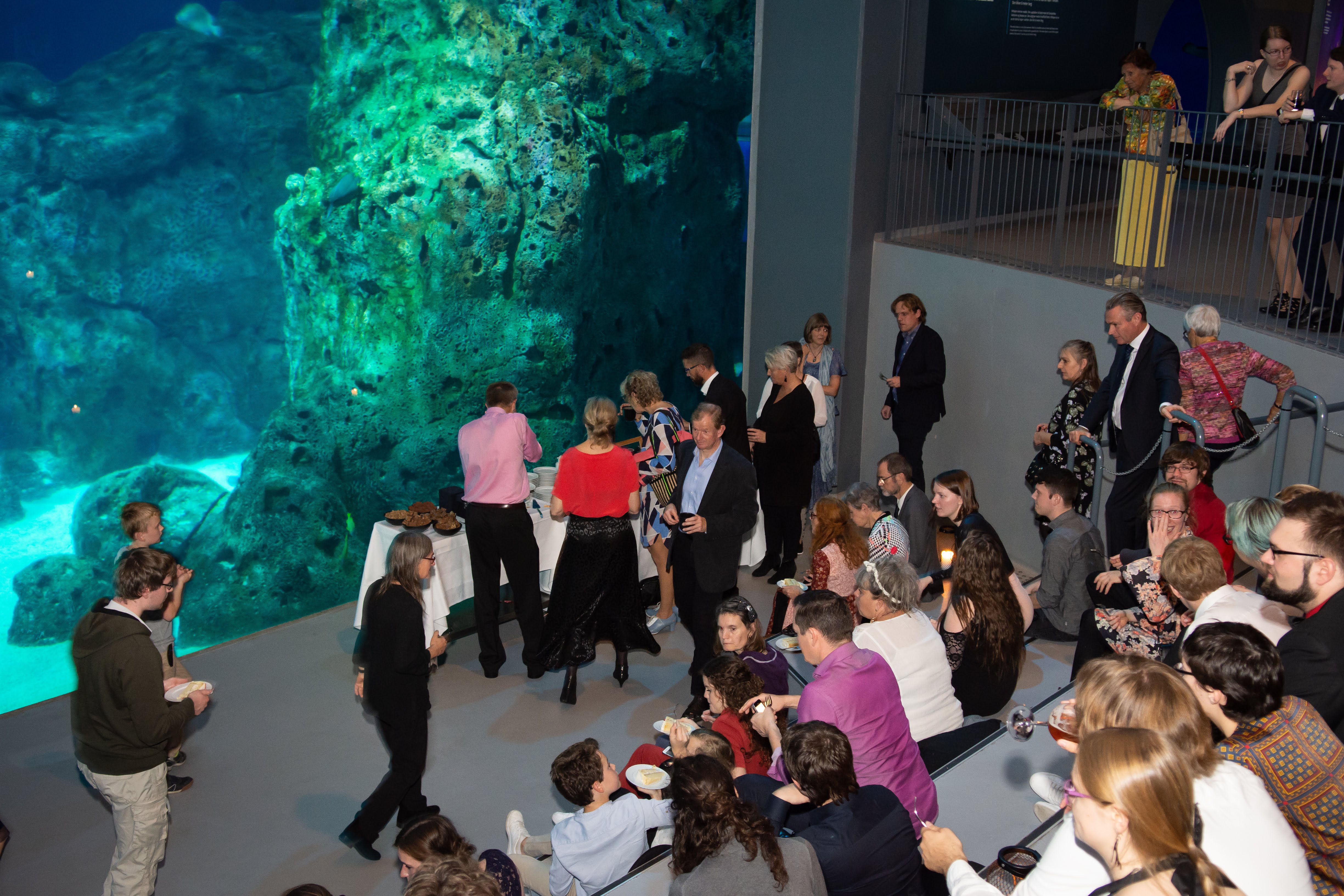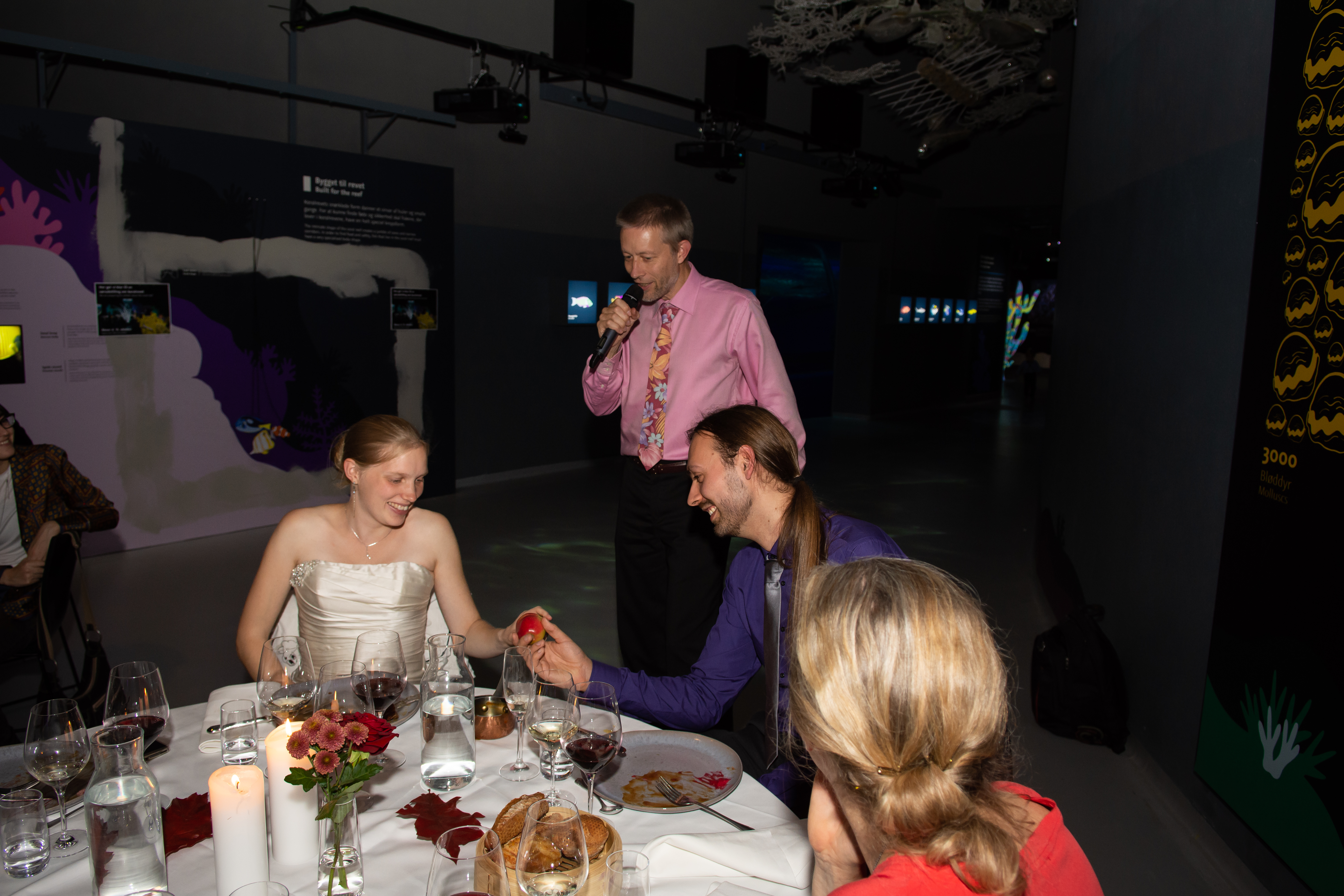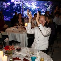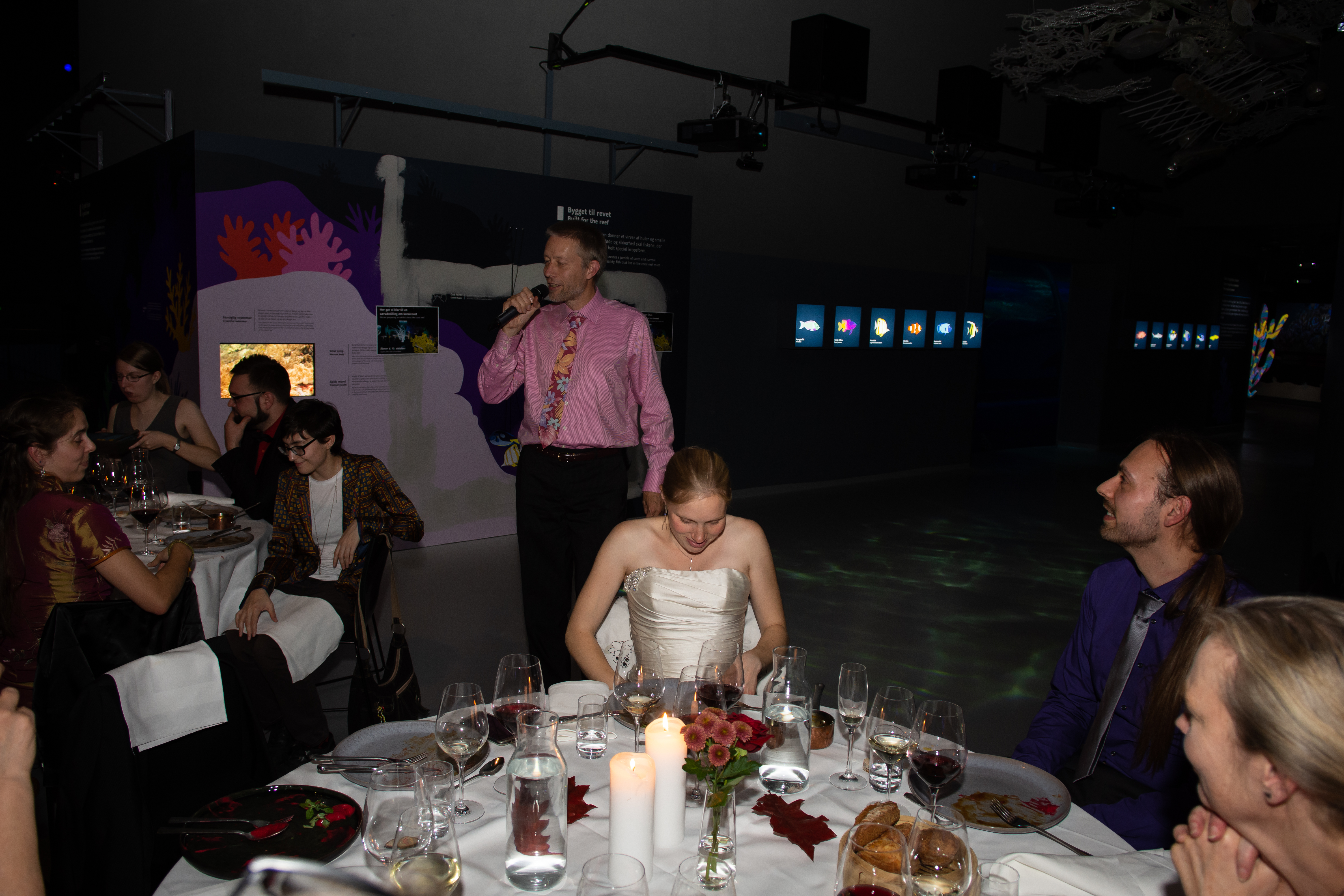 Festen forgår på Den Blå Planet. De holder åbent for deres normale besøgende indtil kl. 17 og derefter skal de nå at gøre klar til festen. Derfor vil det ikke være muligt at komme ind før kl. , hvor vi vil starte ud med velkomstdrinks.